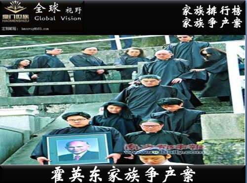 已故香港富豪霍英东的家族爆发争产风暴,霍英东长房三子霍震宇,以遗产执行人身份入禀高等法院,要求罢免另外两名遗产执行人,包括胞兄霍震寰及姑姑霍慕勤,并建议高院委任退休法官罗杰志或其他合适人选与他共同管理霍英东遗产。入禀状指,霍英东于1978年5月20日订立最后一份遗嘱,所有太太和子女都是受益人。遗嘱指示受托人,在霍英东死后20年内不可分配剩余的遗产,而是按月支付定额生活费给各受霍家争产案益人,而霍震寰独揽大权,把遗产据为己有,又要挟霍家长房成员按他建议分配遗产,否则不分遗产给他们,而霍慕勤年老体弱,与挂名执行人无异,故要求罢免他俩及要求霍震寰归还遗产。
